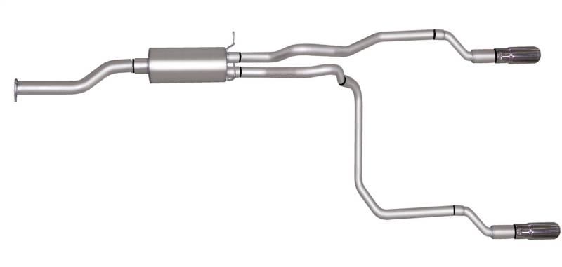 For the enthusiast who wants an awesome look and aggressive throaty sound this Dual Split Cat back exhaust is for you. Gibson Exhaust Systems decrease backpressure and produce more torque and increased horsepower. Typical gains average of 15-20 horsepower. Stainless dual Tip exit straight out the back. Works with most bumpers, roll pans and trailer hitches. Exhaust sound is louder under towing conditions. Hassle Free bolt- on installation. No welding required. Backed by a Lifetime Limited Warranty.