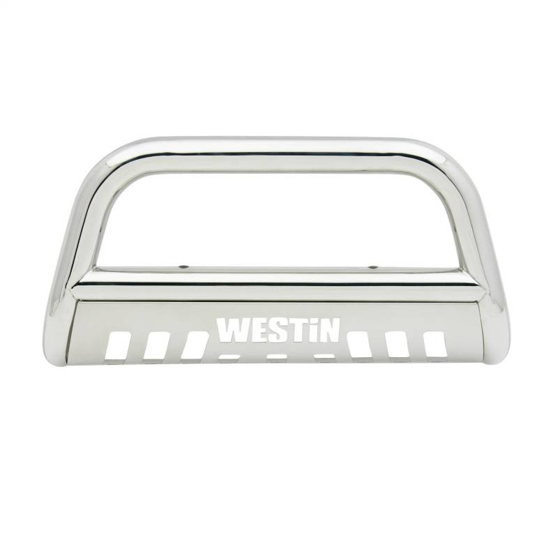 Westin(TM) E-Series Bull Bars are a front-end light bar designed for trucks and larger model SUVs. It is made of 3 diameter polished stainless steel tube. It mounts utilizing existing vehicle mounting points and installation does not require any drilling to the vehicle frame. Comes complete with mounting kit the Westin(TM) E-Series Bull Bar provides a mounting point for 2 auxiliary lights up to 6 in diameter. It features a die-cut Westin(TM) block logo design on the stainless steel skid plate unique to the Westin(TM) E-Series Bull Bar.