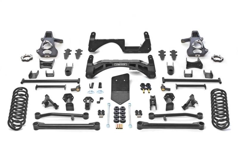 Fabtech has developed multiple systems for late model T900 platform SUVs and SUTs. Common to these systems is our proven one piece high arched lower crossmember design with an integrated differential skid plate for solid support of the front suspension. Special attention was given to the design of replacement extended length steering knuckles to keep the track width of the vehicle near stock while retaining turning radius for easy maneuverability in tight areas. All rear systems feature extended length tubular upper and lower link arms with an oversized Trac bar relocation bracket to properly place the axle under the vehicle with zero driveline vibration. AutoRide and non AutoRide specific rear coil springs maintain proper ride height on all models. The Basic System features the above mentioned components along with front strut assembly spacers and rear performance coil springs. This system provides a stock like ride and is compatible with all AutoRide models. Fabtechs Performance System provides the Dirt Logic 2.5 coilover front shocks for superior damping. This Performance system will provide a supple highway ride with outstanding offroad damping capabilities for the best of both worlds. Installation of all systems does not require relocation of the Rack and Pinion or disassembly of the front strut assemblies.