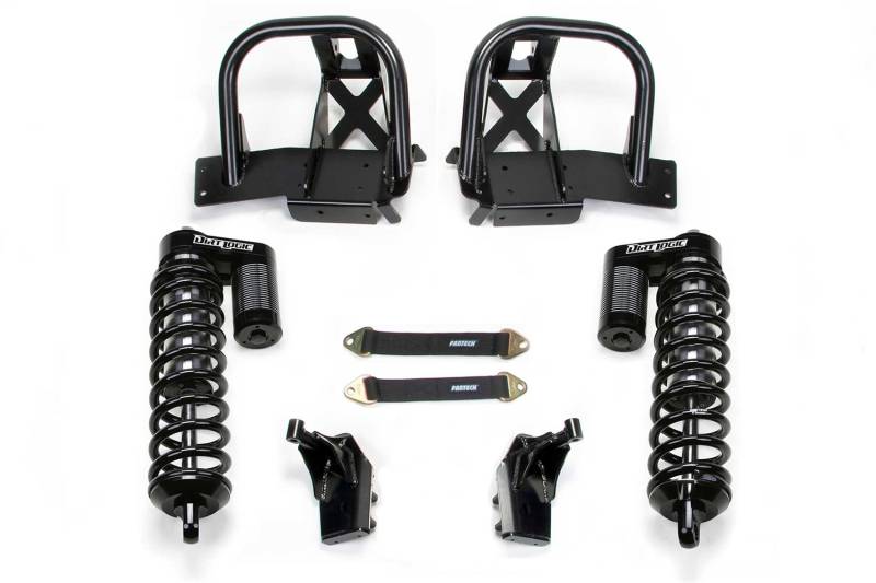 Fabtech steps out of the box with the release of our Coilover Shock conversion system for the ultimate Super Duty suspension upgrade. This Coilover conversion directly replaces the stock Coil Spring buckets with super stout gusseted 1 3/4 in. tubing for exceptional strength. This Coilover conversion system allows use of the Dirt Logic 4.0 Coilover Shocks. To complete this high end Coilover conversion opt for our hydraulic bump stops. This Coilover Shock System is compatible with our Radius Arm and 4 Link systems.