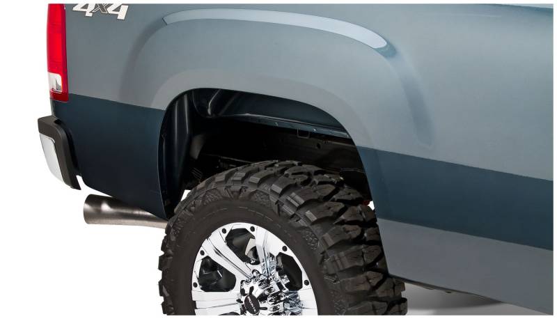 You've equipped your vehicle with oversize wheels and tires for serious off-road traction and clearance. Now you need extra tire coverage to protect your rig's body and maybe even comply with local laws. Bushwacker Extend-A-Fender Flares deliver premium-grade protection and style matched to oversized tires, yet as tough as they are, they go on easily with no drilling required. You can install them in minutes and enjoy them for years. Our exclusive Dura-Flex 2000 material is designed for added durability and flexibility with built-in UV protection. Your Extend-A-Fender Flares resist chalking, cracking, and warping, whether you leave them with their OEM-style matte black finish or paint them for a totally personalized look. Either way, your truck will look factory-equipped for your off-road tires. Extend-A-Fender Flares go on easy, perform tough, and look great.