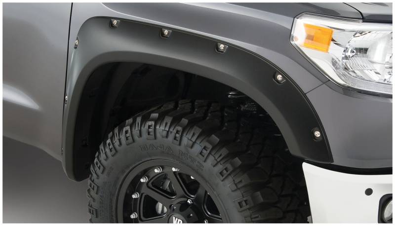 With their recessed stainless steel bolts and massive presence, Pocket Style Fender Flares are a Bushwacker original and an off-road icon. They give you the hard-core look of bolt-on flares, with no body-side sheet metal drilling required. Pocket Style Fender Flares are custom-designed for your vehicle to complement oversized tires and high-clearance lift kits. You can mount them right out of the box with their tough, OEM-style matte black finish they're UV protected so they won't chalk. You can also paint them to match or accent the body color for a factory-custom look. Pocket Style Fender Flares are made from our thick, warp-resistant Dura-Flex 2000 material and tailor-made for added durability and flexibility on the trail. When you need maximum tire coverage with minimum time and effort, it's in the pocket. Pocket Style Fender Flares from Bushwacker.