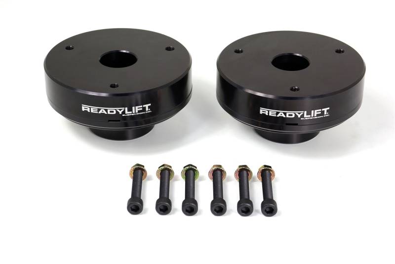 Level your truck with style, fit and function for larger tires and wheels. ReadyLIFT T6 Billet Suspension leveling kits are made in the USA using only premium 6061 T6 aircraft billet aluminum and includes 10.9 rated mounting hardware and associated kit parts to get the leveling lift job done right with super cool looks! ReadyLIFT leveling kits are direct bolt-on applications maintaining the factory ride and factory alignment specifications. No cutting or drilling is required when installing our new T6 Billet kits. The ReadyLIFT line of stylish leveling kits are now available in a tough anodized black, silver, blue and red finish and are laser etched with our ReadyLIFT(R) Suspension logo. The T6 Billet line is the ultimate in looks and leveling functionality! Our development team precisely engineers proprietary features into all ReadyLIFT leveling kits to insure the right leveling kit and advertised lift amount for each application. T6 Billet offers truck and SUV owners the option to leveling their vehicles with a custom appearance.