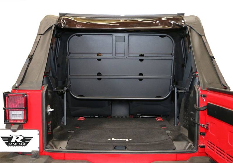 Rear sport rack is a lightweight durable steel tubular interior storage rack with bottom base panel. Fits both soft and hardtop applications. Safety lock catch in lowered position - hides secure lower compartment for concealed storage. Safety tie down openings across the base panel that is retractable when not in use. High pressure gas shocks pull and hold tray in upright (out of the way) position. Textured dual stage powder coat finish and a no drill installation. Securely fastens to factory attachment points.