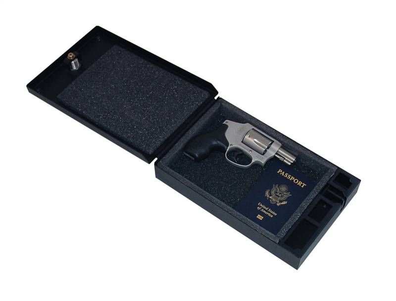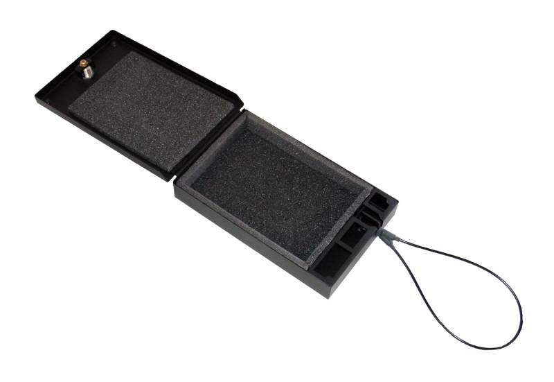 Weighing less than 4 lbs., this lockable welded steel storage box can be used to secure a firearm and protect valuables while carrying it by hand between locations, during travel, inside a vehicle, home or office. Keyless entry is provided by Tuffy's 3 digit combination lock with a two-point steel cam for added security. The included 2 ft. long, 2000 pound test, steel security cable secures the safe to any sturdy mounting surface by attaching to the 1/8 inch steel security cable anchor point. The inside is lined with low-density foam to protect the contents, while compression bumpers keep the lid vibration-free when closed.
