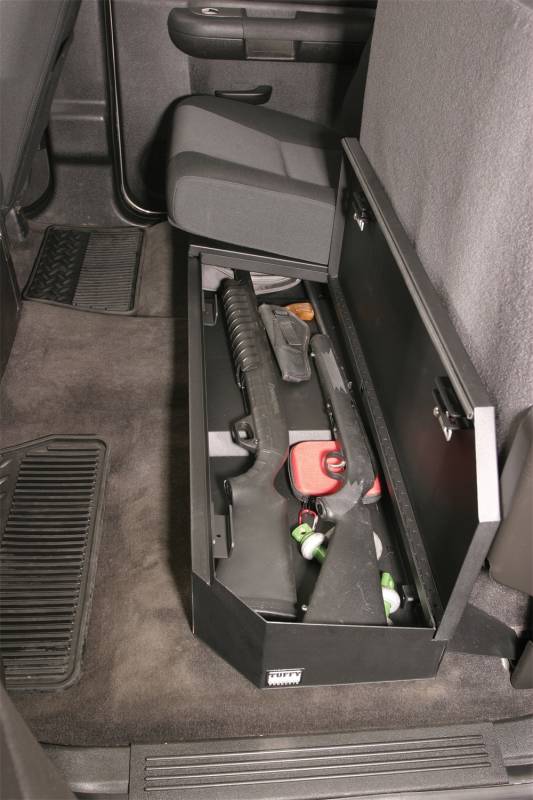 This high security welded steel security lockbox mounts under the rear seat in 2007-2018 Chevy/GMC Crew Cab 1500 and 2007-2019 2500HD/3500HD trucks. The full width formfitting design of the Tuffy lockbox has over 3500 cubic inches of lockable storage. Its secured contents are easily accessed by flipping either or both rear seat(s) up and opening the corresponding lid(s). The unique design allows the full width to be used to stow firearms or other long items. Featuring Tuffy's Pry-Guard Locking System with a 10 tumbler double bitted security lock with built in weather seals. Chamfered corners are incorporated into the design for easier passenger access. The innovative mounting system is only accessed from inside the box. When additional floor space is needed the entire lockbox can be removed in seconds without the need for any tools.