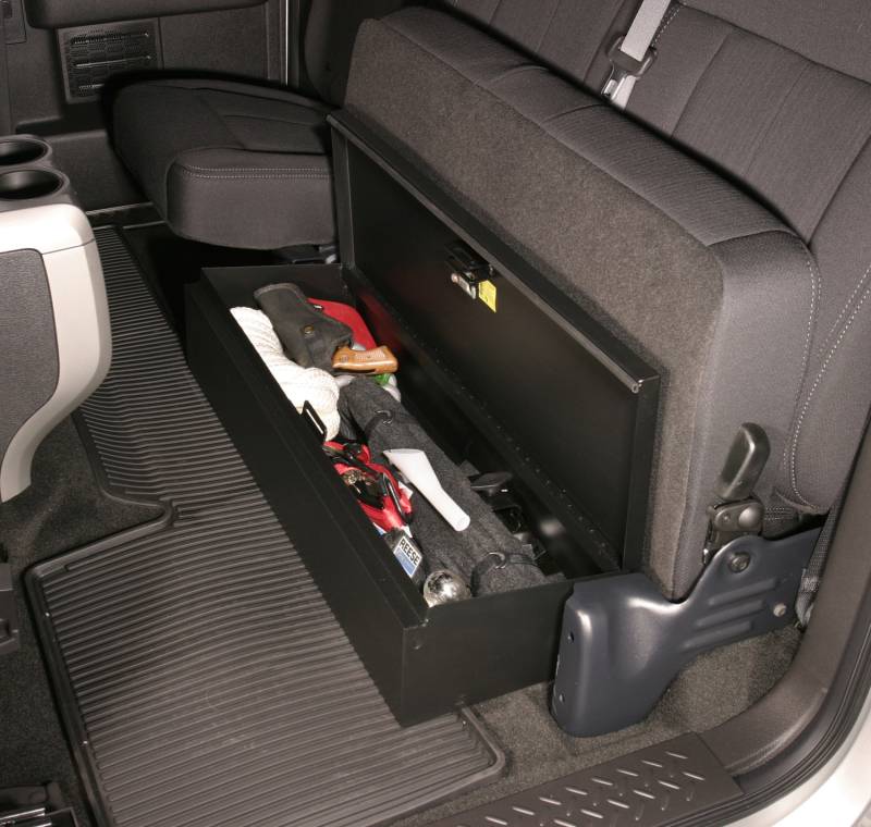 This high security steel lockbox mounts under the rear seat (Driver side) in your 2009-2014 Ford F-150 F150 or Raptor Extended Cab with or without the subwoofer option. The formfitting design of the Tuffy lockbox has over 2075 cubic inches of lockable storage. Its secured contents are easily accessed by flipping the rear seat up. The unique design allows the OEM jack to still be mounted to the original bracket but additionally secured inside the lockbox. Featuring Tuffy's Pry-Guard Locking System with a 10 tumbler double bitted security lock with built in weather seals. Mounts inconspicuously under the seat out of apparent site of opportunistic thieves. Is quickly and easily installed without drilling.