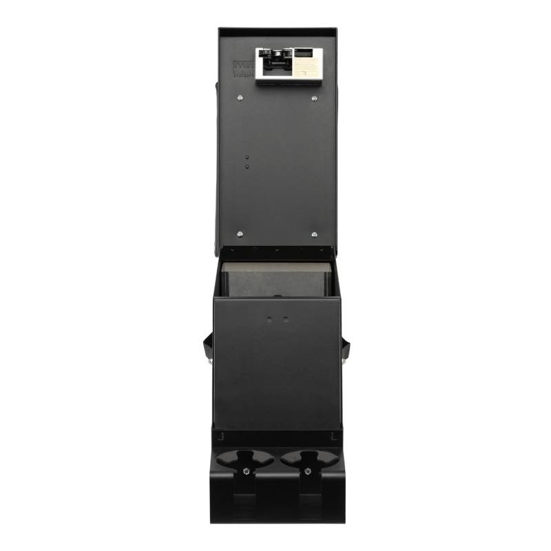 This high security 16 gauge steel console features Tuffy's patented pushbutton latch system. For safety and convenience while operating the vehicle, the lid also latches closed without having to be locked. It has a spacious compartment for mounting a CD changer, storing tools, electronic equipment, cellular phones, and other valuables. Rubber floor mat is included; other accessories are available.