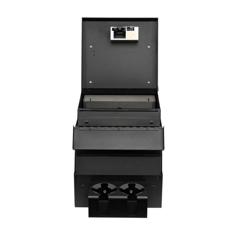 This convenient 12 1/2 inch wide, 16 gauge steel security console features Tuffy's patented pushbutton latch system. For safety and convenience while operating the vehicle, the lid also latches closed without having to be locked. It has 2 compartments, a separate compartment for mounting a stereo, CB Radio, or other electronic equipment, and a lockable rear storage space lined with a rubber floor mat. The spacious rear compartment accommodates a CD changer, tools, and other valuables.
