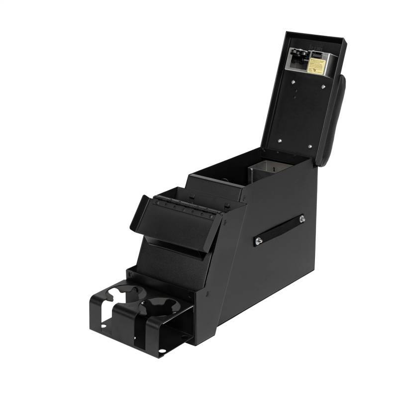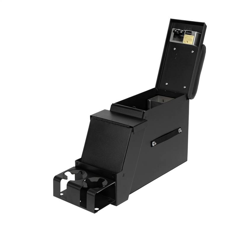 This convenient 6 1/2 inch wide, 16 gauge steel security console features Tuffy's patented pushbutton latch system. For safety and convenience while operating the vehicle, the lid also latches closed without having to be locked. It has 2 compartments, a separate compartment for mounting a stereo, CB Radio, or other electronic equipment, and a lockable rear storage space lined with a rubber floor mat. The spacious rear compartment accommodates a CD changer, tools, and other valuables. Other accessories are also available.
