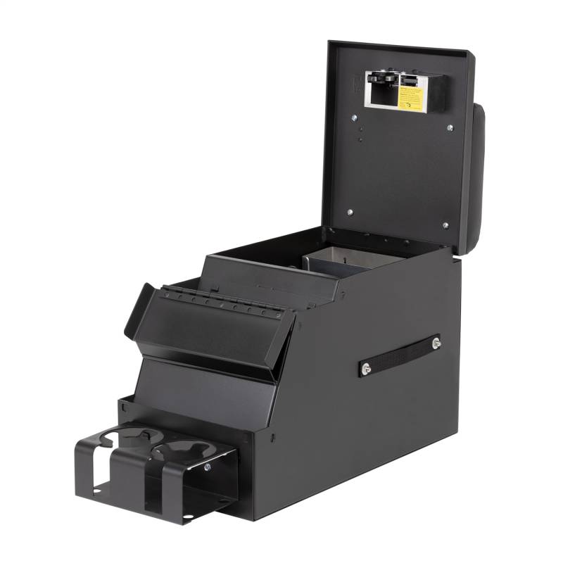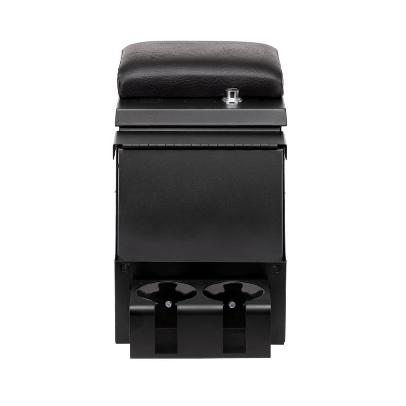 This convenient 10 inch wide, 16 gauge steel security console features Tuffy's patented pushbutton latch system. For safety and convenience while operating the vehicle, the lid also latches closed without having to be locked. It has 2 compartments, a separate compartment for mounting a stereo, CB Radio, or other electronic equipment, and a lockable rear storage space lined with a rubber floor mat. The spacious rear compartment accommodates a CD changer, tools, and other valuables.