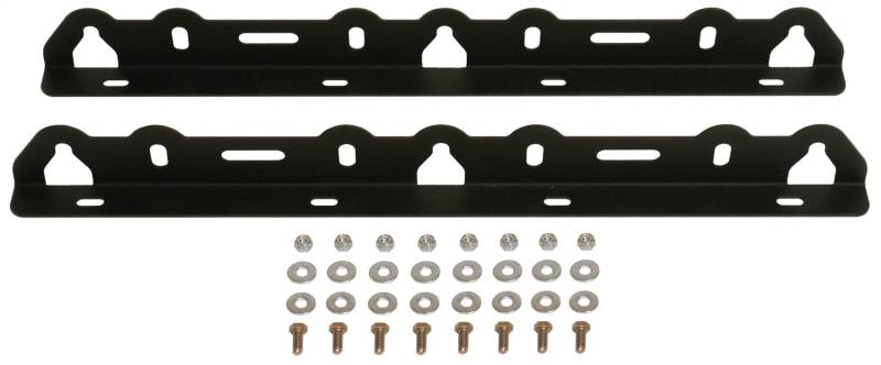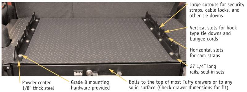 These 11 gauge (1/8 inch) thick steel tie down rails are designed to mount on top of most Tuffy drawers and any solid mounting surface. They are a great way to organize and secure loose items such as a cooler or fridge, camping gear, and outdoor recreation equipment. The unique design works with security straps, cables, hook type tie down straps, bungee cords, nets, and a variety of other securing straps. Featuring grade 8 mounting hardware to positively fasten each heavy duty powder coated rail to the mounting surface.