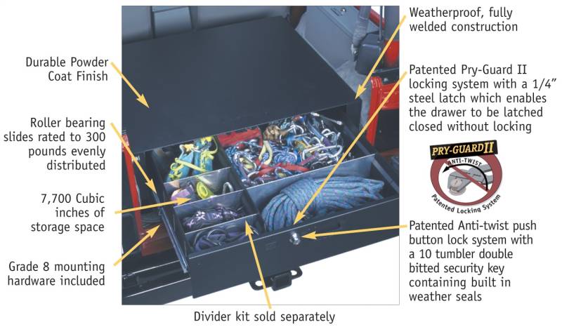 This heavy duty, high security steel drawer mounts in place of the rear seat in any vehicle with sufficient space. Designed for the Jeep Wrangler, the large drawer slides on heavy duty roller bearings and can be securely locked to provide protection for equipment and other valuables. Add dividers, carpet lining and tie-downs for extra functionality.