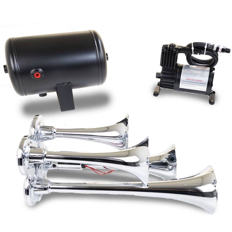 Quad air horn with four tuned trumpets 13 inches, 11 inches, 8.5 inches and 7 inches in length. Additional trumpets create a more fully-blended tone while being compact enough to fit almost any vehicle. Includes an easy-to-fit, 130 PSI, 1 gallon air system. Available in chrome or XCR2.0(TM) black finish P/N HK4-1.