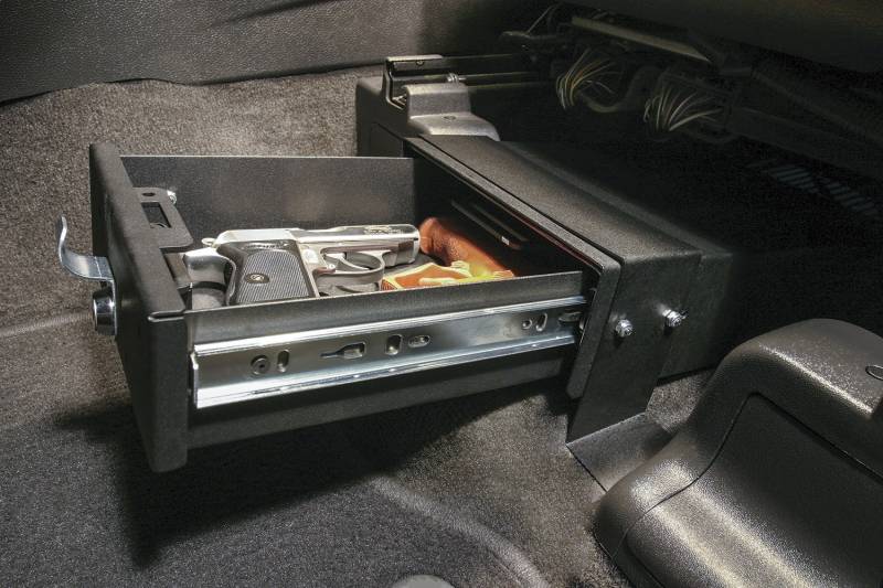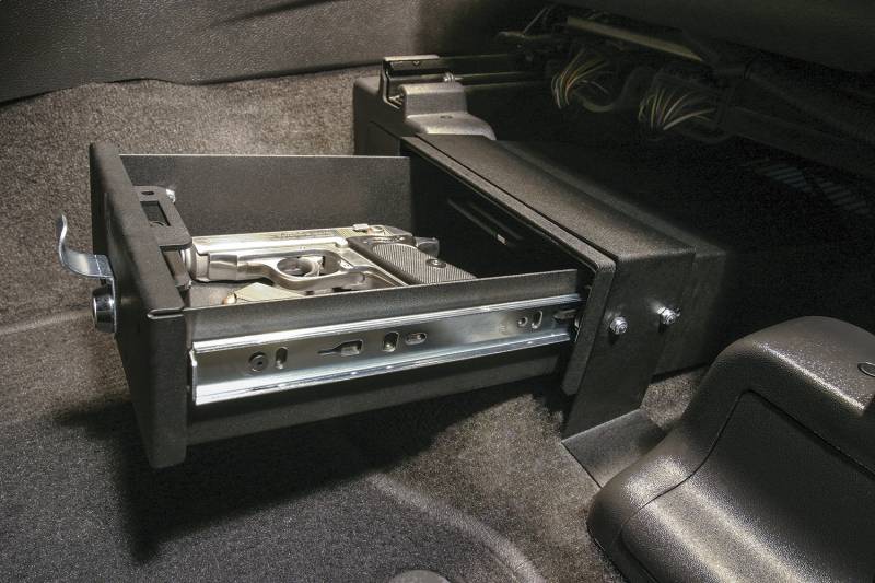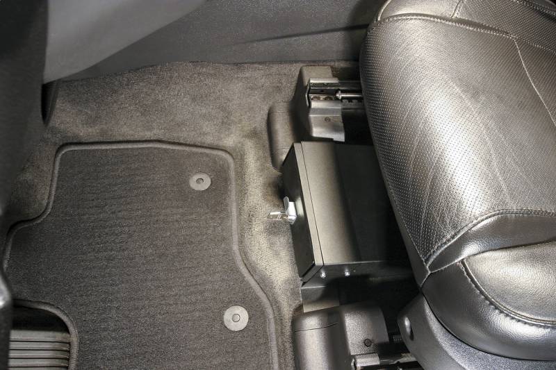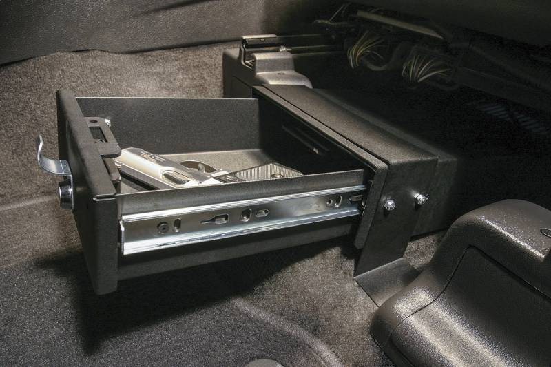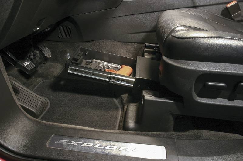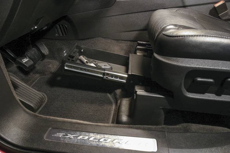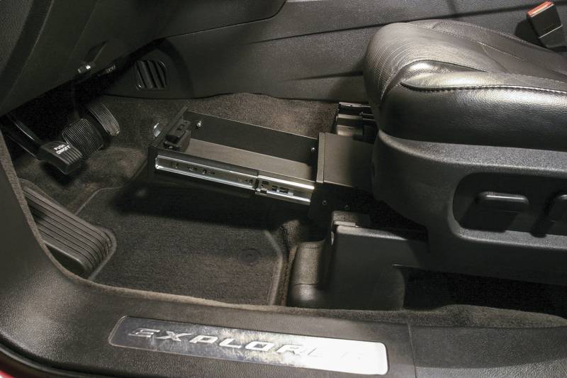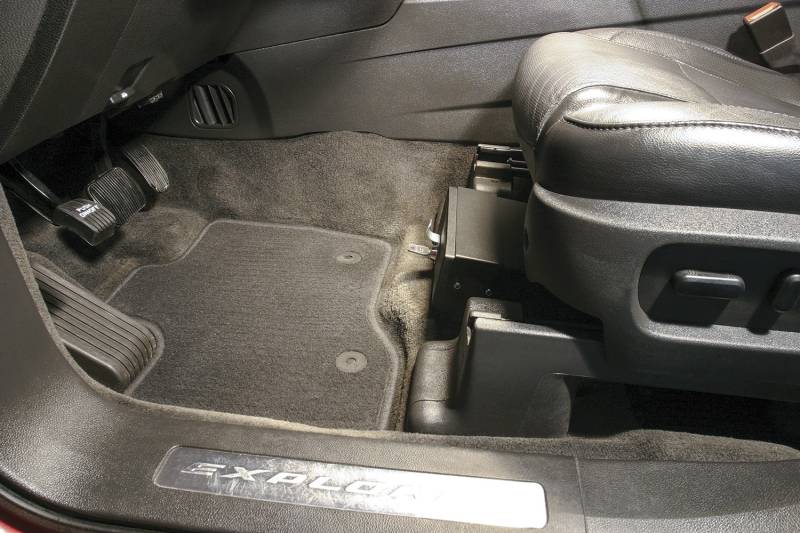 This high security 16 gauge steel security drawer mounts under the drivers or passengers side seat in a Ford Explorer (NOTE: does not fit Explorer Sport or ST models). The formfitting design of the Tuffy lockbox has over 200 cubic inches of lockable storage with no need to reroute under seat wiring harnesses. It's secured contents are easily accessed by maneuvering the drawer open and closed on the smooth ball bearing slides using the convenient pull lever. Featuring Tuffy's Pry-Guard Locking System with a 10 tumbler double bitted security lock with built in weather seals. The design incorporates a heavy duty fully extending slide system, weather seal and welded construction. A formed rib in the enclosure additionally strengthens the locking system. Tuffy's exclusive bolt-blocker bracket is included for additional security. Mounts inconspicuously under the seat out of apparent site of would be thieves.