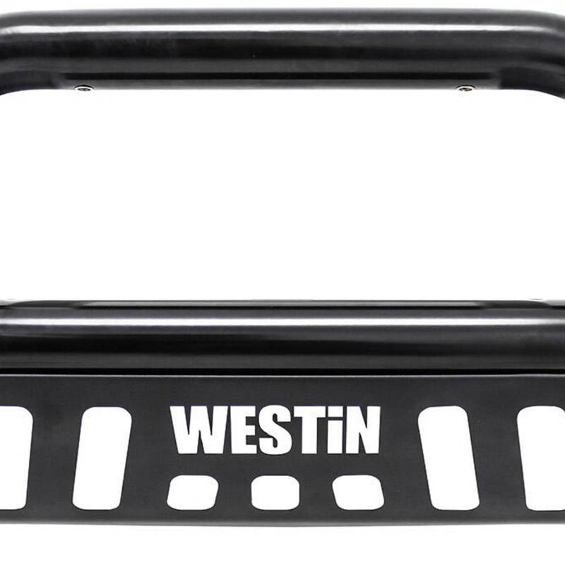 Westins E-Series Bull Bar is a front-end light bar designed for trucks and larger model SUVs. It mounts to the vehicles existing mounting points with no drilling required and comes complete with vehicle specific mount kit. It also features mounting points for 2 auxiliary lights up to 6 inches in diameter. The E-Series Bull Bar features a laser cut Westin block letter logo design on the skid plate. Available in black powder coated e-coated steel with a textured black skid plate backed by a 3 year warranty. Optional license plate bracket is available.