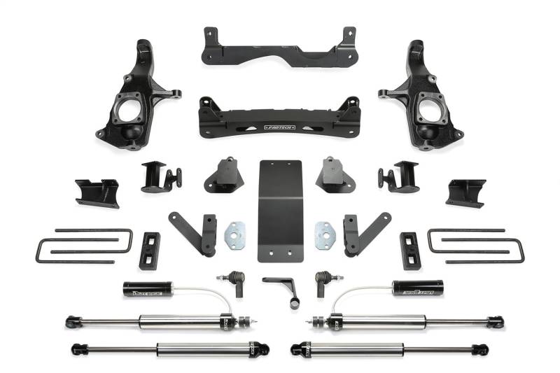 Fabtechs new 4 crossmember systems utilize their proven heavy duty construction and design features for a robust suspension upgrade. The 4 system features high arched lower control arm crossmembers constructed of 1/4 thick steel for maximum strength. The Fabtech ductile iron steering knuckles retain the near stock track width keeping tires under the fender for a clean appearance. Rear lift is accomplished with a block and u bolt configuration.