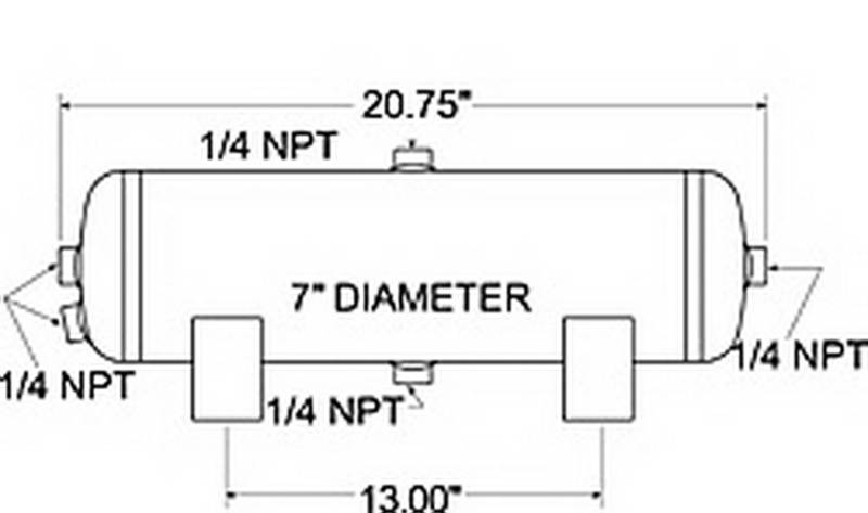 3 Gallon - 7 in. Dia. - 20.75 in. Length - Four 1/4 in. NPT Ports - One 1/8 in. NPT Port - 150 PSI Max - Black