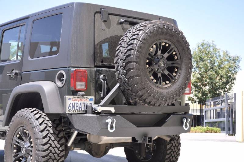 DV8 Offroad bumpers are all trail tested and proven designs! 3/16" and 1/4" cold rolled steel, .120 wall tubing, high degree angles and raised corners, Solid D-ring mounts w/ rings included. All bumpers come in textured black powdercoating. Rear Bumper with Tire Carrier Aluminum Handle. Polyurethane axle for smooth operation and class 3 hitch. For 2007 - 2017 Jeep Wrangler all models. Easy installation, no modifications needed and hardware included.