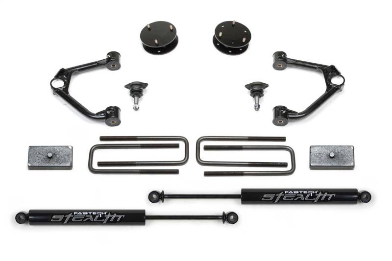 This quality Upper Control Arm system provides a 3.5 in. increased ride height over stock without creating suspension bind at full droop. Lift is accomplished with spacers that utilizes the factory coilover shocks for a stock ride. The Fabtech Upper Control Arms address the geometry of the front suspension with the new ride height for proper align-ability. Heavy duty ball joints allow for extended travel to eliminate binding. Due to the GM suspension geometry there are no differential drop brackets required for the CV axles to operate properly. Rear lift comes from 1 blocks and u-bolts.
