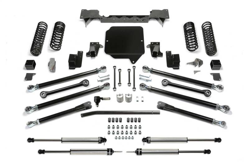 Fabtechs JL Crawler long arm systems are built to meet the most experienced drivers expectations without having a questionably fabricated suspension. If you are in the market for a system that will work properly right out of the box and does not require continued fabrication and constant maintenance, look no further. A key part of the mounting of the Crawlers 5 Ton Link Arms to the frame is the geometry and ground clearance. The location of the frame side of the link arms is critical in providing superior handling throughout the travel range. Fabtech has found the sweet spot geometry for the link arms that provide a superior driving long arm system compared to all others on the market. Front link arm are mounted to a full width crossmember that spans frame rail to frame rail. This crossmember is a key in not only in mounting the Links arms at the correct geometry but it adds critical strength to the lighter weight JL frame for hard offroad use. Rear links attach to new frame mounts on the side of the frame for increased ground clearance and approach angle. The Fabtech lower Link Arms are massive and built of 2 in. OD .313 thick wall tubing that is guaranteed not to bend. Upper and lower Link Arms includes the Fabtechs legendary 5 Ton joints that come with lifetime guarantee of never wearing out. They are superior for offroad use with a smooth quiet operation on the street.