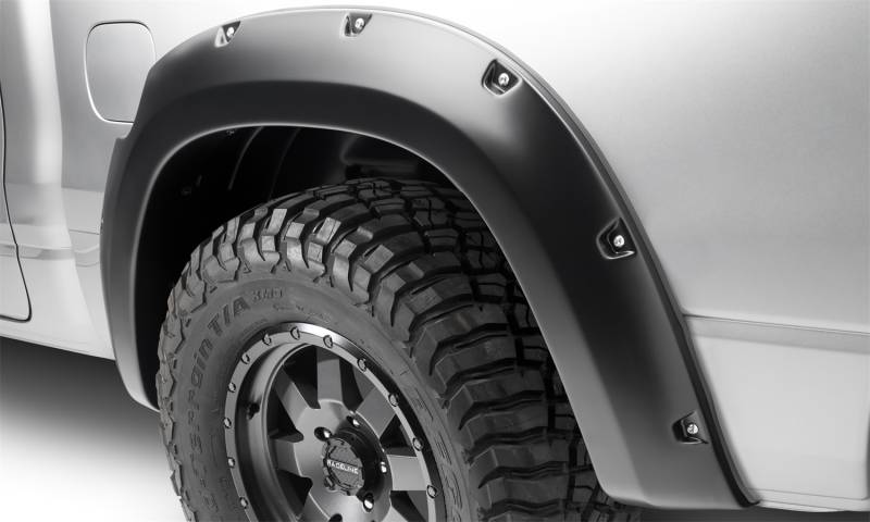 With their recessed stainless steel bolts and massive presence, Pocket Style Fender Flares are a Bushwacker original and an off-road icon. They give you the hard-core look of bolt-on flares, with no body-side sheet metal drilling required. Pocket Style Fender Flares are custom-designed for your vehicle to complement oversized tires and high-clearance lift kits. You can mount them right out of the box with their tough, OEM-style matte black finish they're UV protected so they won't chalk. You can also paint them to match or accent the body color for a factory-custom look. Pocket Style Fender Flares are made from our thick, warp-resistant Dura-Flex 2000 material and tailor-made for added durability and flexibility on the trail. When you need maximum tire coverage with minimum time and effort, it's in the pocket. Pocket Style Fender Flares from Bushwacker.