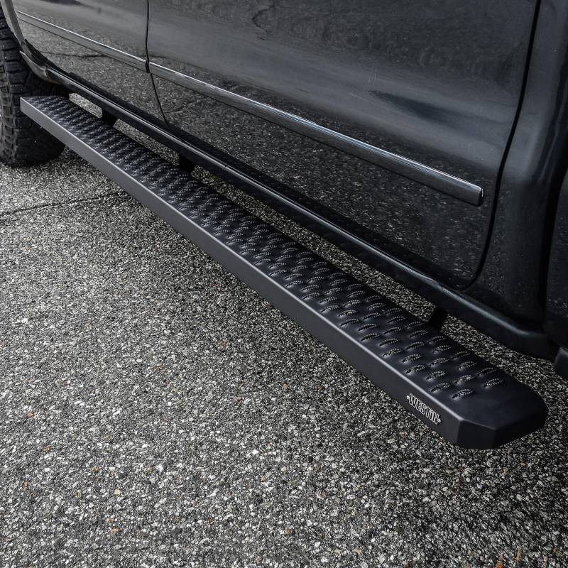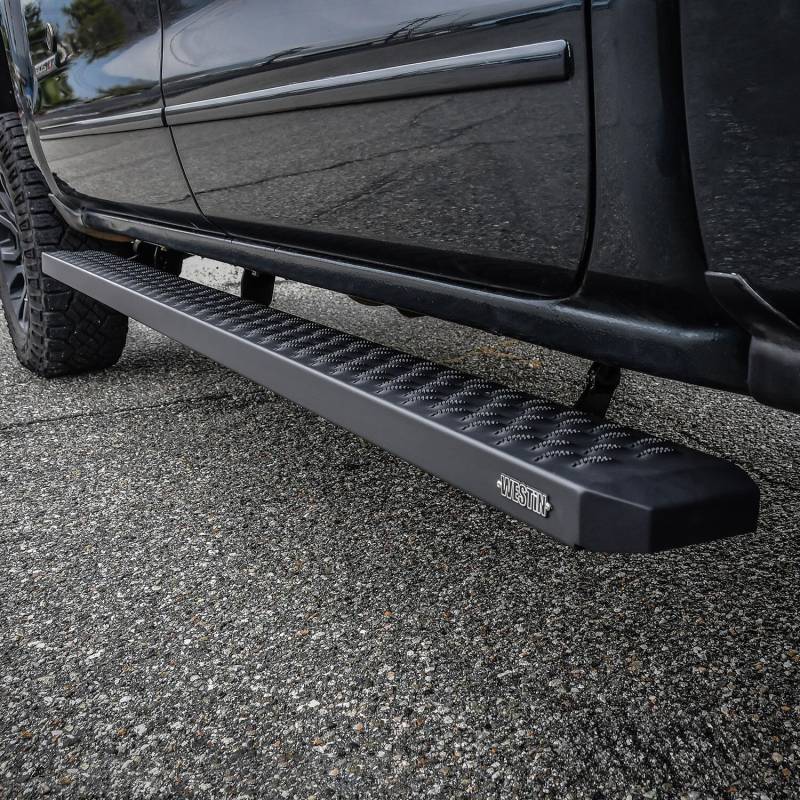 Westins Grate Steps Running Boards are engineered to provide maximum traction without sacrificing style. The 6 1/4in. step surface width features an aggressive 1/4in. high punched tread allowing traction in any weather condition. The unique serrated edges help clean dirt, snow and mud off your boots to keep truck cab clean. Grate Steps Running Boards feature stylishly formed and fully welded ends with a custom die-cast riveted logo badge. E-coated base coat provides long lasting corrosion protection which far surpasses that of the competition. Solid 1-piece construction makes the Grate Steps Running Boards ideal for construction, commercial, vans and utility use. Available in universal lengths (54in., 68in., 75in., 79in., 83in., 86in. and 90in.) with vehicle specific mount kit required, sold separately. Available in textured black finish.