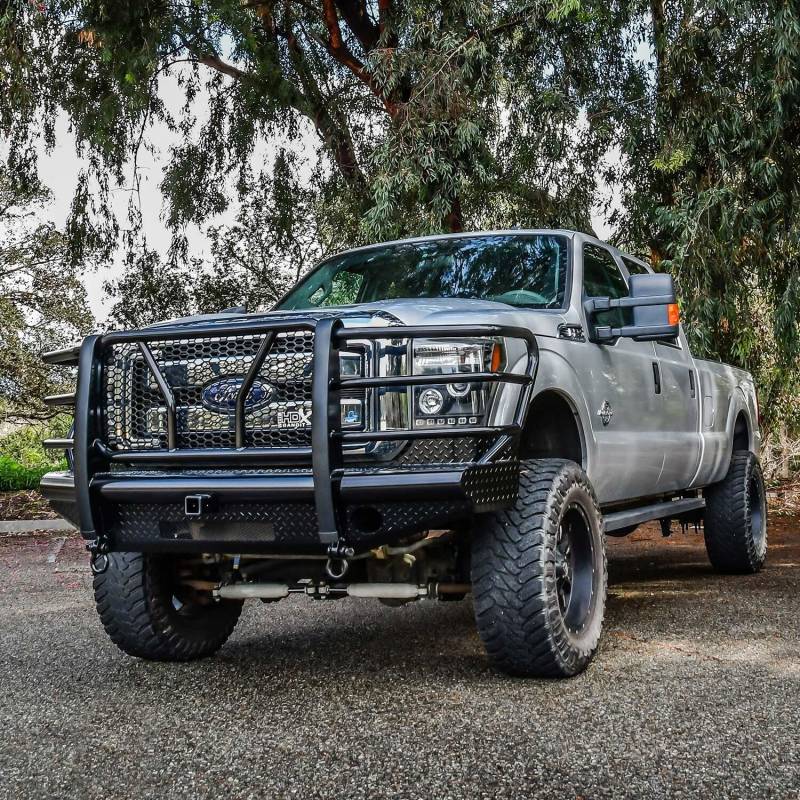 Westins HDX Bandit Bumper combines a heavy duty diamond plate steel bumper constructed of schedule 40 steel pipe with a stylish grille guard featuring 2in. diameter outer wraparound wings and 2 3/4in. wide upright rubber strips. Designed to protect headlights, grille, hood and front fenders from road hazards, debris and wildlife damage. Features a stylish metal honeycomb mesh screen, which allows maximum airflow to the intercooler or radiator area while accenting the front end styling with a clean and rugged look. Removable mesh screens allow for factory camera and adaptive cruise control options available on some late model Ford applications. HDX Bandit Bumper includes a built-in 2in. receiver hitch and (2) heavy duty 9,500 lbs bow shackle mounts, capable of delivering multiple towing options. Compatible for factory fog lamps or LED post mount lights. In addition, some late model Ram and Chevrolet applications feature provisions for factory parking sensors. Bolt-on installation with hardware and mounting brackets included. Available in black powder coat finish.
