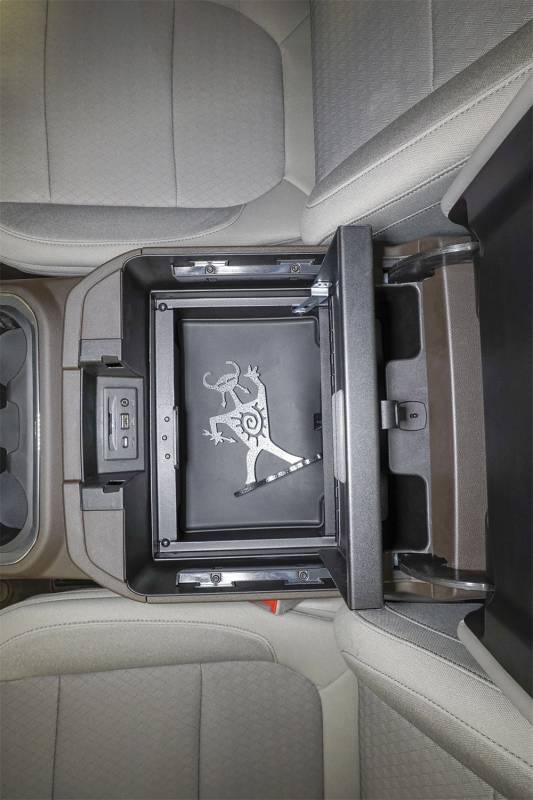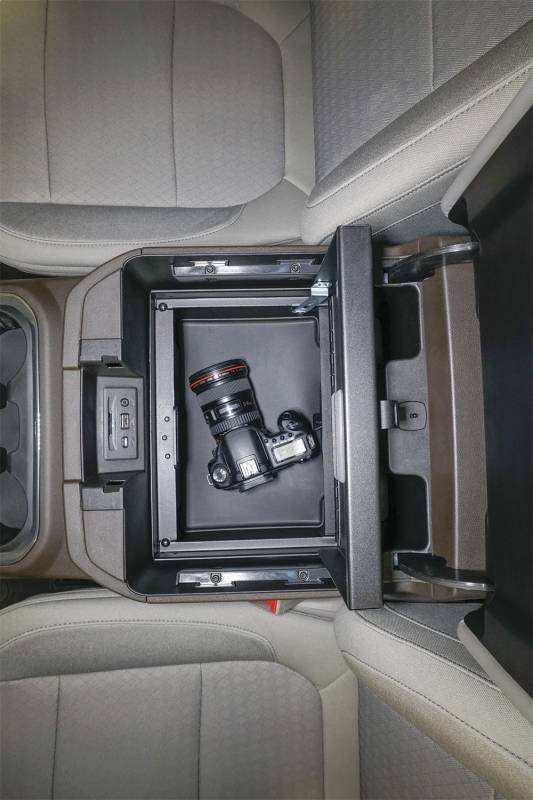 Chevy/GMC owners secure some peace of mind by installing the fully integrated and concealed Tuffy Security Console safe. As part of our ever-expanding line of console safe safes for trucks, the Tuffy Console safe accommodates the OEM USB, SD and AUX ports providing style, security and convenience. The Tuffy Console safe transforms your OEM console into a heavy-duty lockable storage safe using Tuffy's Pry-Guard locking system with 10 tumbler double bitted security key to help protect valuables from opportunistic thieves. The innovative design uses an exclusive lid support feature that keeps the lid open while sticking your hands inside. Grab something quick on the go without fear of the lid slamming shut on your hand. The safe maintains a completely stock look. Finished with a durable texture powder coat, the Console Safe comes ready to install and lasts a lifetime.