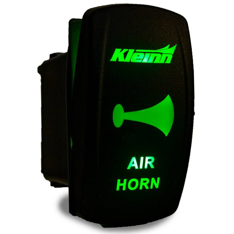 The Kleinn Air Horn GREEN lighted rocker switch will fit in most standard rectangular openings. Let's people know you you only run the best, a Kleinn air horn. The switch is rated at 20 amps (12 volt) or 12 amps (24 volt) and has a pin to backlight the switch. Available in Amber, Blue, Green, Red and White (Must order appropriate part number)
