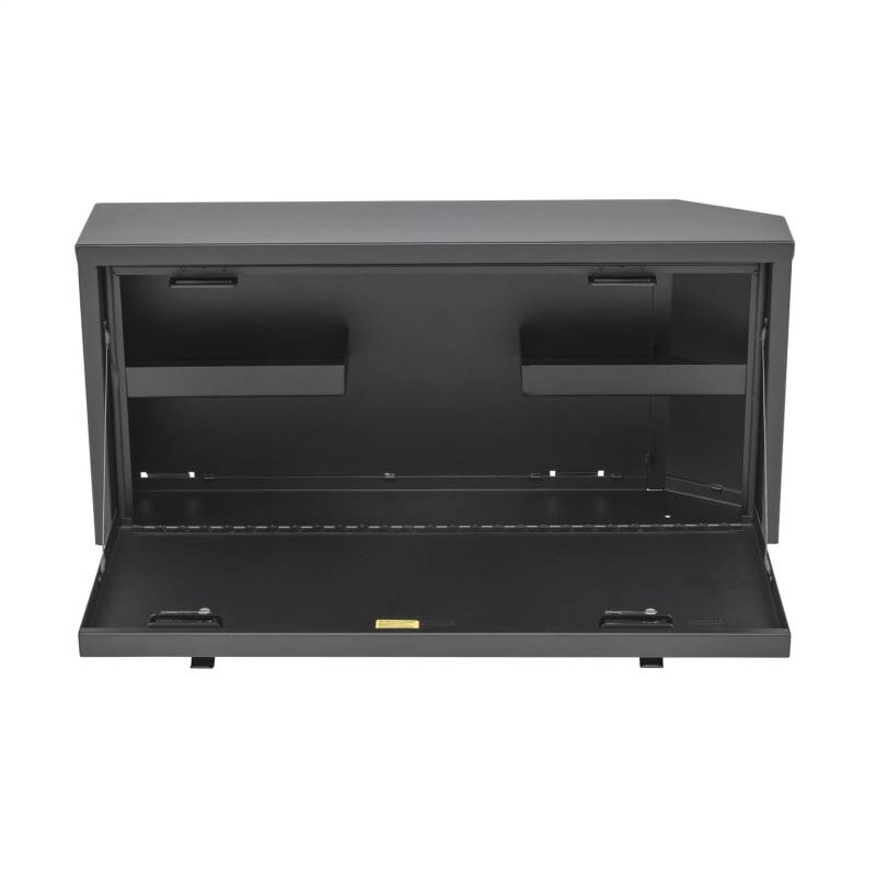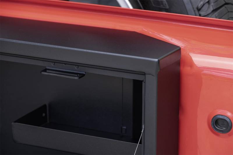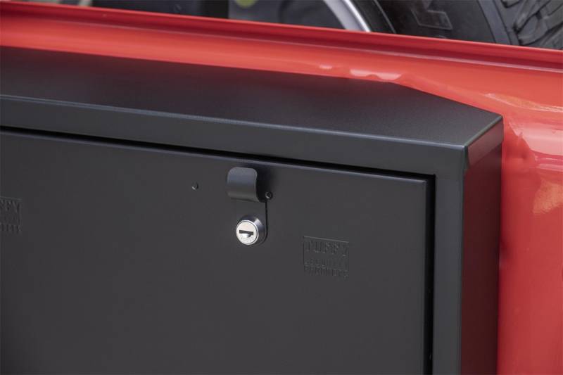 This heavy duty, high security lock box mounts on the inside of the Jeep Wrangler JK tailgate providing ample secure storage for tools and other gear. The door folds down creating a work table for cooking or quick sorting and access of your stuff. The Tailgate Lock Box comes equipped with 2 removable shelves for organization of smaller items. The entire Tuffy JK Tailgate Lock Box is constructed using welded 18-gauge steel, heavy duty fasteners and is covered with a durable textured powder coat finish. The JK Tailgate Lock Box installs to the JK Tailgate Rail mounts using standard hand tools with or without an OEM hardtop. Featuring Tuffy's Pry-Guard Locking System with a 10-tumbler double bitted security lock with built in weather seals.