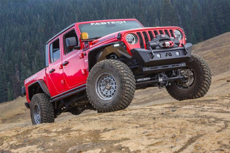 This Trail Lift Kit provides enhanced suspension performance to address all variants of off highway travel use including rock crawling, aggressive trail use and overland expeditions. This Gladiator lift kit has been tuned with proper dual rate coil springs and shock valving to provide a very compliant ride that you will appreciate. The system is a complete short arm suspension that utilizes the factory lower control arm mounts for an easy installation. The Fabtech lower link arms are constructed of thick wall steel tubing that are guaranteed never to bend. They come with large polyurethane bushings on one end with internal threads on the other to accept the groundbreaking Fabtech 5 Ton Joint(R) for longevity and a quiet ride. Fabtech's dual rate Gladiator coil springs are corner specific to the Jeep JT. This keeps the vehicle level side to side and allows for increased suspension travel. The first stage of the spring provides a soft ride with the ability to extend for additional travel. The second stage is designed to handle the payload of the vehicle and address large impact absorption at higher speeds. To address the steering geometry with the increased ride height, a Draglink Flip kit along with a heavy duty Track Bar bracket is included. This relocates the Gladiator steering geometry to the factory plane allowing for full articulation without binding the draglink ends in extreme conditions. The rear Gladiator suspension receives a heavy duty Track Bar bracket to center the axle under the vehicle with the new ride height and help retain the factory roll center of the vehicle. Front and rear bumps stop extensions protect the Jeep Gladiator suspension from over cycling. This popular Jeep Gladiator lift kit is a top choice for daily drivers that enjoy tackling tough trails and overlanding with the comfort that they have a high quality complete suspension under their Gladiator.