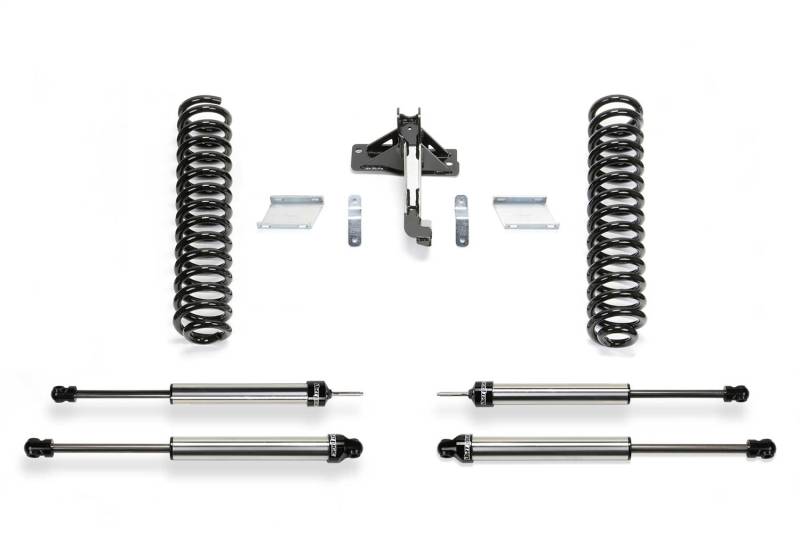 This Super Duty lift kit is perfect for the enthusiast looking to run oversized tires and wants additional wheel travel for offroad use. With the large Super Duty wheelwell openings and this quality 2.5 in. lift kit, you can run 35 in. tall tires with ease. Fabtech's coil springs retain the factory load carrying capacity while providing increased suspension travel. The coil springs and associated bracketry allow for an additional in. of compression travel over stock without binding the suspension. This extra travel helps when offroading in rugged terrain. Sway bar drop brackets are included to reposition the front bar so that the link ends do not go over center at full droop and cause bind. The brake lines are relocated down on the frame with extension brackets to eliminate the possibility of overstretching the lines throughout the new travel range. Fabtech provides extension brackets rather than longer brake lines to keep the factory brake system sealed for fast and trouble-free installation. This suspension kit utilizes the factory bump stops without extensions. This allows for more travel with the Fabtech coil springs and components. To help keep the factory alignment specifications of the vehicle, Fabtech includes 2 degree adjustable alignment ball joint inserts. They help retain the factory caster specifications for optimum driveability. After a Super Duty is lifted the front axle is pushed to one side due to the length of the track bar. To address this issue Fabtech provides a heavy-duty adjustable track bar. The Fabtech track bar allows for on the vehicle adjustment to center the axle under the vehicle. This provides proper tracking of the front and rear axle for excellent highway manners. This Super Duty lift kit includes Fabtech Performance shocks. They are a twin tube shock that will provide a good highway ride with the ability to tackle offroad.