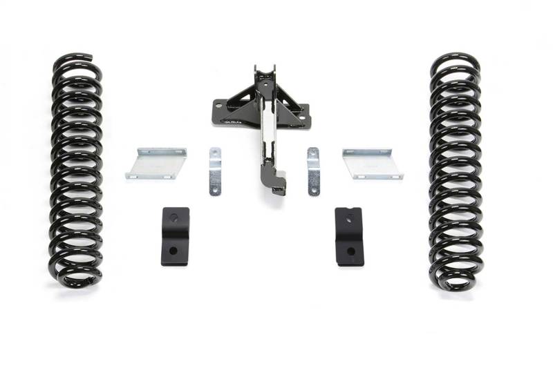 This Super Duty lift kit is perfect for the enthusiast looking to run oversized tires and wants additional wheel travel for offroad use. With the large Super Duty wheelwell openings and this quality 2.5 in. lift kit, you can run 35 in. tall tires with ease. Fabtech's coil springs retain the factory load carrying capacity while providing increased suspension travel. The coil springs and associated bracketry allow for an additional in. of compression travel over stock without binding the suspension. This extra travel helps when offroading in rugged terrain. Sway bar drop brackets are included to reposition the front bar so that the link ends do not go over center at full droop and cause bind. The brake lines are relocated down on the frame with extension brackets to eliminate the possibility of overstretching the lines throughout the new travel range. Fabtech provides extension brackets rather than longer brake lines to keep the factory brake system sealed for fast and trouble-free installation. This suspension kit utilizes the factory bump stops without extensions. This allows for more travel with the Fabtech coil springs and components. To help keep the factory alignment specifications of the vehicle, Fabtech includes 2 degree adjustable alignment ball joint inserts. They help retain the factory caster specifications for optimum driveability. After a Super Duty is lifted the front axle is pushed to one side due to the length of the track bar. To address this issue Fabtech provides a heavy-duty adjustable track bar. The Fabtech track bar allows for on the vehicle adjustment to center the axle under the vehicle. This provides proper tracking of the front and rear axle for excellent highway manners. This Super Duty lift kit includes Fabtech Performance shocks. They are a twin tube shock that will provide a good highway ride with the ability to tackle offroad.