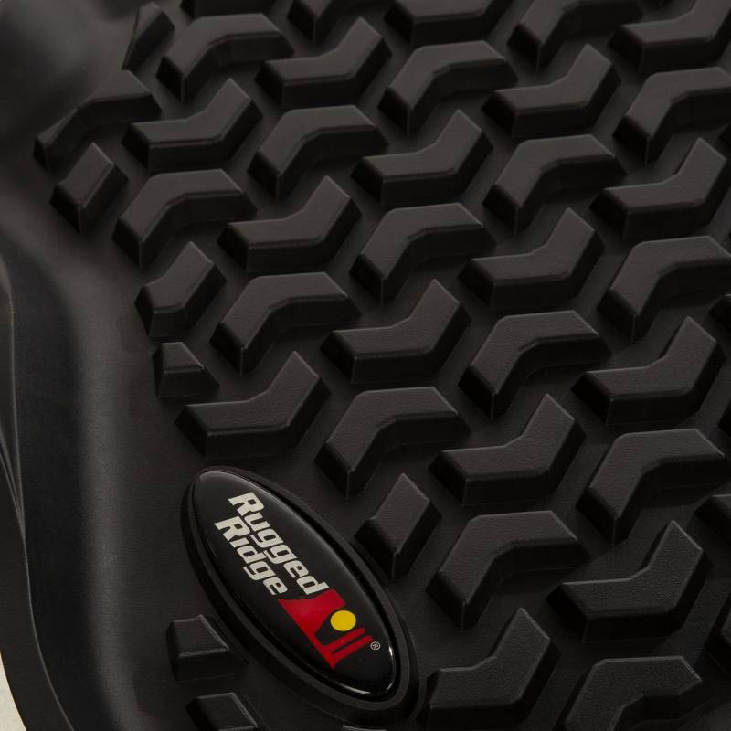 Rugged Ridge Floor liners provide complete protection for the cabin floor of your vehicle while keeping it looking factory fresh. Each liner is injection molded to keep it's shape in all temperatures and is perfectly contoured to your vehicle's floor for precise secure fitment (floor hook attachment where applicable). The raised lip captures all spills, water and debris keeping your interior pristine. The Chevron-shape patented Deep Tread Technology channels liquid away from your shoes keeping them dry. Made of a durable OE-quality thermoplastic material that can withstand the rigor of daily abuse. Backed by our Limited Lifetime Warranty. Patent 8,173,369, D627,285, 2,699,641