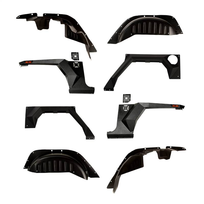 Rugged Ridge Armor Fenders for Wrangler JK are not just another bolt-on accessory. We developed our Armor Fenders with such a brawny & bold styling; they're capable of transforming your rig into an unmistakable, attention-grabbing shadow if its former self. High body lines and aggressively arched wheel openings provide greater clearance for larger tires and allow for improved wheel travel and articulation off-road. Each fender is constructed of heavy gauge 3 mm thick steel, utilizing fold-and-weld construction, for greater structural integrity you can appreciate. Each section is meticulously finished with a resilient black textured powder coat that protects from real-world road hazards. The Armor rear fenders revolutionary 2-piece design allows for full encasing of the taillight and allows for a fitment that is free of gaps for tight fitment and unsurpassed protection while the front fenders integrated vent screen helps expel engine heat for better overall performance. Installs using the OE wheel liners (with some modification) OR with Rugged Ridge All-Terrain Wheel Liners 11620.50 (recommended). Armor fenders work with all factory components as well as Rugged Ridge Spartan Grill, Aluminum Hood Latches and even Rubicon Rock Rails. Includes marker light assemblies and complete installation instructions. Patent Pending.