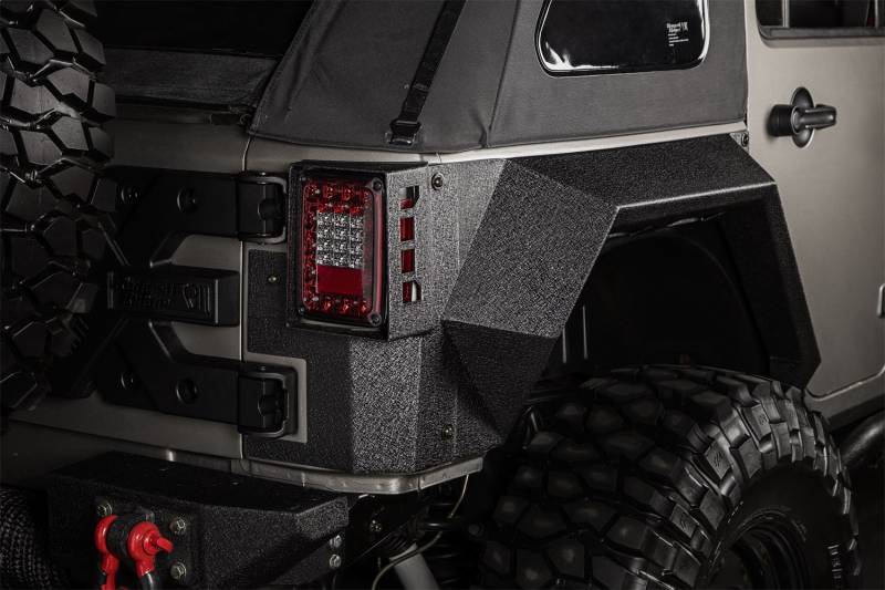 Rugged Ridge Armor Fenders for Wrangler JK are not just another bolt-on accessory. We developed our Armor Fenders with such a brawny & bold styling; they're capable of transforming your rig into an unmistakable, attention-grabbing shadow if its former self. High body lines and aggressively arched wheel openings provide greater clearance for larger tires and allow for improved wheel travel and articulation off-road. Each fender is constructed of heavy gauge 3 mm thick steel, utilizing fold-and-weld construction, for greater structural integrity you can appreciate. Each section is meticulously finished with a resilient black textured powder coat that protects from real-world road hazards. The Armor rear fenders revolutionary 2-piece design allows for full encasing of the taillight and allows for a fitment that is free of gaps for tight fitment and unsurpassed protection while the front fenders integrated vent screen helps expel engine heat for better overall performance. Installs using the OE wheel liners (with some modification) OR with Rugged Ridge All-Terrain Wheel Liners 11620.50 (recommended). Armor fenders work with all factory components as well as Rugged Ridge Spartan Grill, Aluminum Hood Latches and even Rubicon Rock Rails. Includes marker light assemblies and complete installation instructions. Patent Pending.