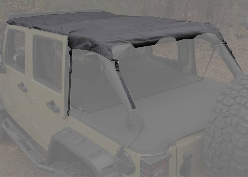 The Montana Pocket Topper is engineered to provide cooling shade to both front and rear seat passengers enhancing the overall open-air driving experience. This new design features tough black diamond fabric combined with a pair of handy zippered front pockets and one large rear pocket that provide convenient and discrete storage on Wrangler TJ models. Unlike many other summer tops on the market, the Rugged Ridge Montana design features wider side hook and loop fastener straps, a reinforced front section and extra heavy duty nylon tie down straps for a secure fitment. Requires use of an aftermarket windshield header, like 13308.04, for installation.