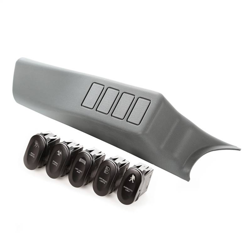 Looking for a handy place to mount your accessory switches that doesn't require cutting or other modifications? This A-Pillar Switch Pod Kit from Outland Automotive has pre-molded cutouts to allow you to mount up to four aftermarket switches, in easy reach, on the driver's side A-pillar, and out of the way of the shifter handle. Our Pillar Pod has the textured molded finish just like the factory cover it replaces. It snaps into place just like the OE for a great fitment! Each kit includes the driver side A-Pillar Switch Pod and FIVE 2-position Etched Rocker Switches (Zombie Lights, Light Bar Lights, Sasquatch Lights, Rock Lights and Off-Road Lights)