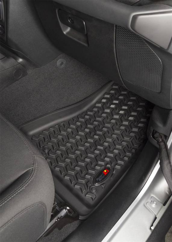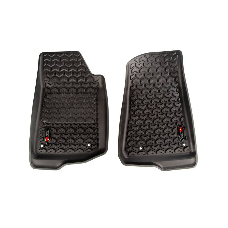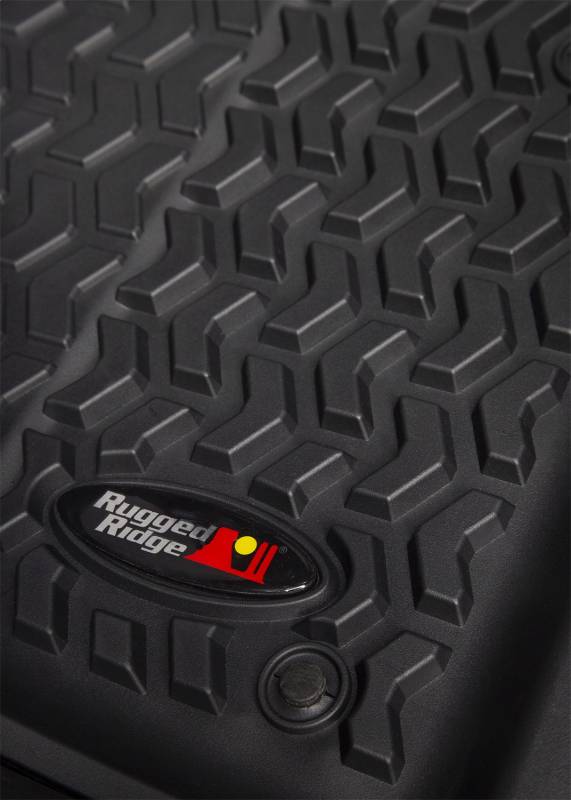 Rugged Ridge Floor liners provide complete protection for the cabin floor of your vehicle while keeping it looking factory fresh. Each liner is injection molded to keep it's shape in all temperatures and is perfectly contoured to your vehicle's floor for precise secure fitment (floor hook attachment where applicable). The raised lip captures all spills, water and debris keeping your interior pristine. The Chevron-shape patented Deep Tread Technology channels liquid away from your shoes keeping them dry. Made of a durable OE-quality thermoplastic material that can withstand the rigor of daily abuse. Backed by our Limited Lifetime Warranty. Patent 8,173,369, D627,285, 2,699,641