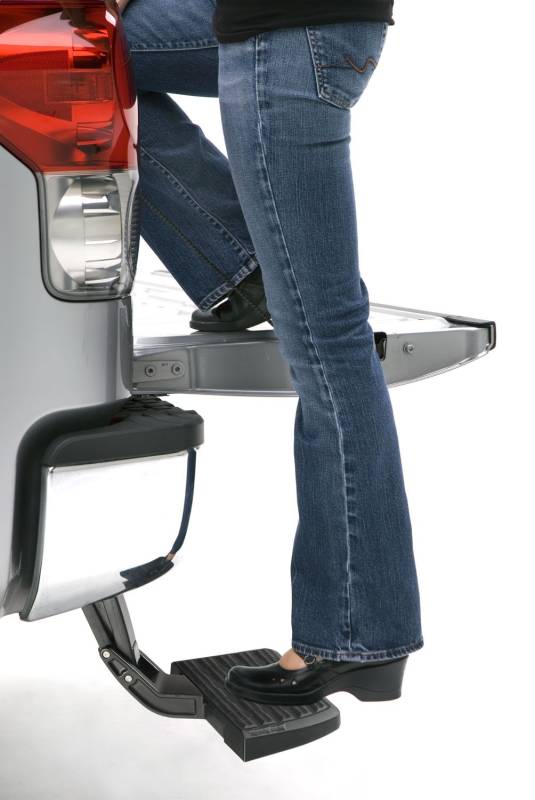 Go ahead and step on it. Bedstep is a real time saver. Not to mention knee and back saver. Strong and rugged, this non-slip, retractable bumper step quickly flips down with the nudge of a foot providing a faster, easier and safer way to load or unload your pickups cargo. Supports up to 300 lbs. Frame mounts under the rear bumper so it works even with an open tailgate or when towing.