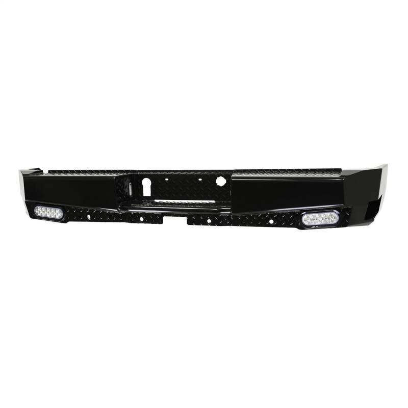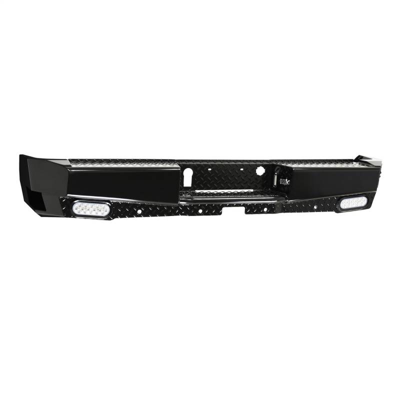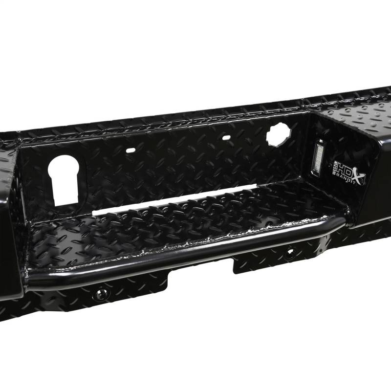 Stand out from the Competition with the all new HDX Bandit Rear Bumper from Westin. Built to compliment the style, precision, and durability of the matching HDX Bandit Front Bumper, this all new "off-road style" rear bumper, is clearly a cut above. Unlike the competition, which features an overlapping two piece design and an ugly weld which can warp the metal and is prone to rust, the new HDX Bandit Rear Bumper features an extremely clean, one piece design. The stamped diamond plate step surface is constructed of 11 gauge plate steel and features a welded inner structure for maximum strength. A unique "corner step" design provides extra wide step area to allow easy access to bed and cargo area. HDX Bandit Rear Bumper includes hardware, mounting brackets, flush mount LED license plate lights and two standard LED back up lights. Fully compatible with blind spot monitors and parking sensors, and can also accommodate an OEM hitch. HDX Bandit Rear is designed for heavy duty performance and extended life that is backed by a 3 year warranty with a black powder coat finish. The new HDX Bandit Rear Bumper is truly in a class by itself.