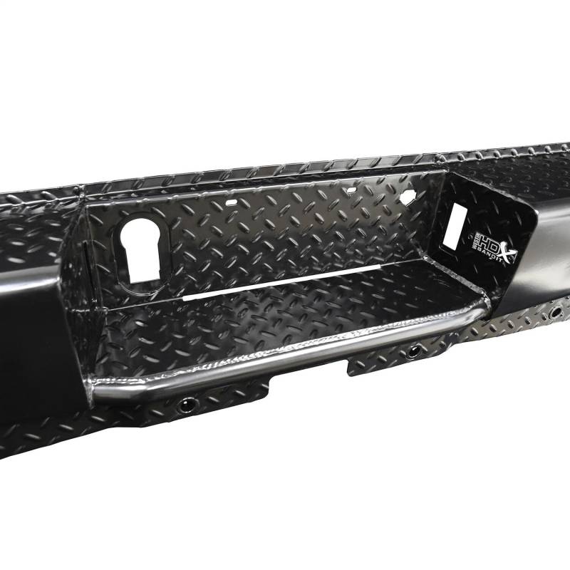 Stand out from the Competition with the all new HDX Bandit Rear Bumper from Westin. Built to compliment the style, precision, and durability of the matching HDX Bandit Front Bumper, this all new "off-road style" rear bumper, is clearly a cut above. Unlike the competition, which features an overlapping two piece design and an ugly weld which can warp the metal and is prone to rust, the new HDX Bandit Rear Bumper features an extremely clean, one piece design. The stamped diamond plate step surface is constructed of 11 gauge plate steel and features a welded inner structure for maximum strength. A unique "corner step" design provides extra wide step area to allow easy access to bed and cargo area. HDX Bandit Rear Bumper includes hardware, mounting brackets, flush mount LED license plate lights and two standard LED back up lights. Fully compatible with blind spot monitors and parking sensors, and can also accommodate an OEM hitch. HDX Bandit Rear is designed for heavy duty performance and extended life that is backed by a 3 year warranty with a black powder coat finish. The new HDX Bandit Rear Bumper is truly in a class by itself.