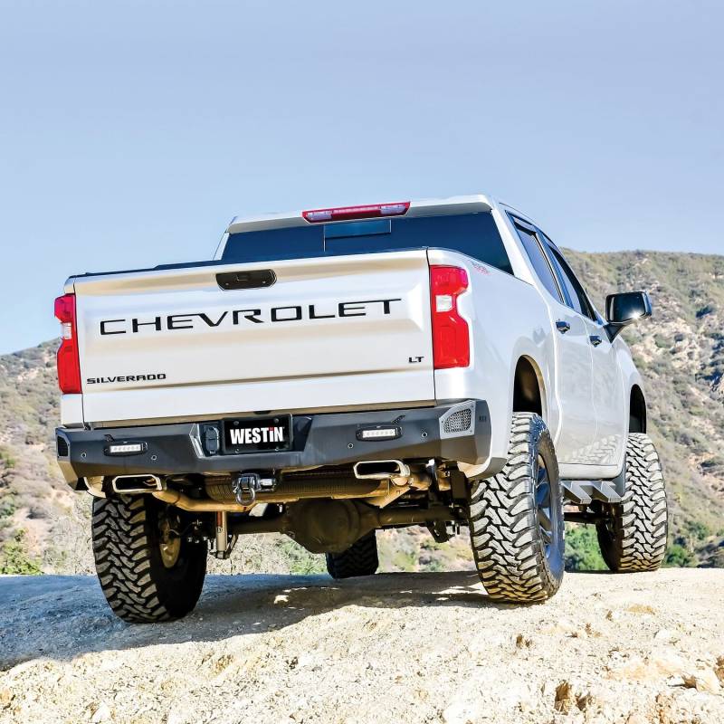 High and Tight best describes the great looking new Pro-Series Rear Bumpers from Westin. This all new "off road style" rear bumper features a light weight, slim, one-piece design, adding a modern, aggressive look to your truck. Built to improve ground clearance and departure angles when driving in more rugged terrain. The Pro-Series Rear Bumper is fully compatible for OEM parking sensors, hitch, and blind spot monitors. It also includes two LED license plate lights and can accommodate LED back up lights (sold separately). Featuring a textured black finish with an e-coated base coat, providing long lasting corrosion protection from the elements with easy bolt-on installation. Just add the original Pro-Mod Front Bumper, and your transformation from stock to custom is complete.