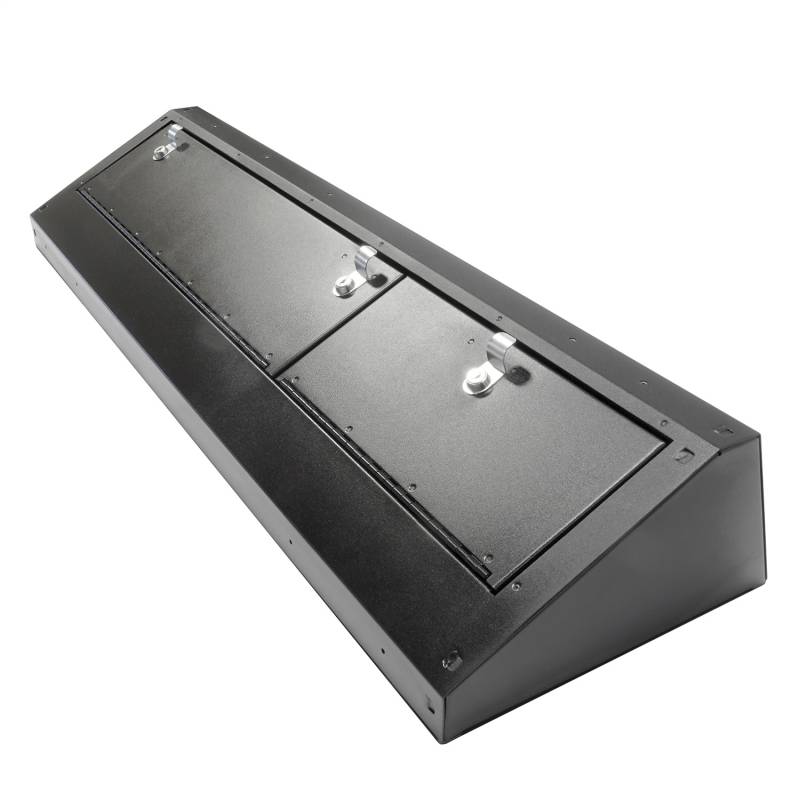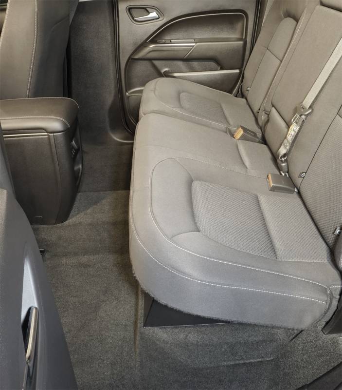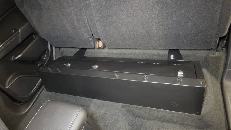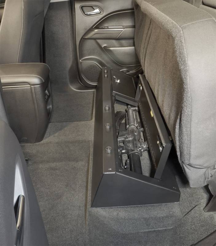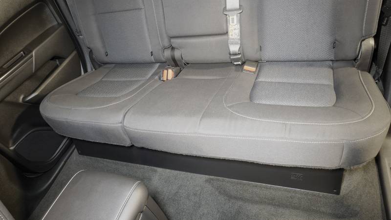 This high security welded steel security lock box mounts under the rear seat in your 2014-2022 Chevy Colorado or GMC Canyon Crew Cab truck. The full width formfitting design of the Tuffy lock box has over 2100 cubic inches of lockable storage. Its secured contents are easily accessed by flipping either or both rear seat(s) up and opening the corresponding lid(s). The unique design allows the full width to be used to stow firearms or other long and valuable items. Featuring Tuffy's Pry-Guard Locking System with a 10 tumbler double bitted security lock with built in weather seals, the entire lock box conceals neatly under the lowered rear bench seat. The lock box is quickly and easily installed using the factory hardware without drilling.