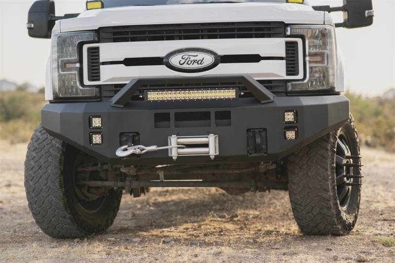 For those of you that need more features, be sure to select the winch option. This is a different bumper that includes bolt-on 1 in. thick steel shackle mounts and an aluminum skid plate. Finally, this bumper also includes the steel winch carrier that can fit up to a 16.5k standard chassis winch with the 4.5 in.x10 in. standard mounting holes, we do recommend clocking the clutch release 90 degrees and relocating the control box for easier access since the winch mounts foot forward. Even with all of these features, the front face of the bumper is only 6 in. in front of the grille of the truck (not including the bolt-on RT light mount).