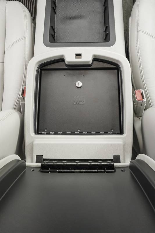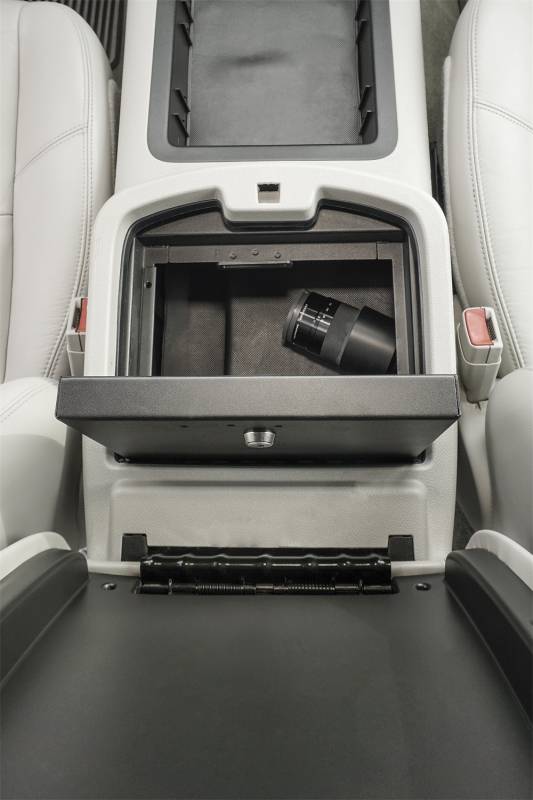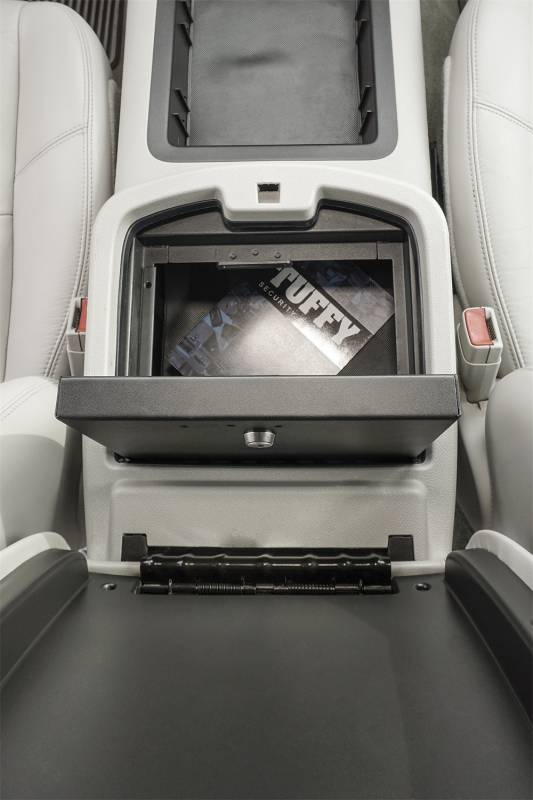 Secure your peace of mind by installing the fully integrated and concealed Tuffy Security Console Safe. As part of our ever-expanding line of Security Console Safes for trucks, the Tuffy Console Safe accommodates the OEM 12 volt port with style, security and convenience. The Tuffy Console Safe transforms your OEM console into a heavy-duty lockable storage safe using Tuffy's Pry-Guard locking system with 10 tumbler double bitted security key to help protect valuables from opportunistic thieves. The innovative design uses an exclusive hand saving lid support that keeps the lid open when you're grabbing stuff inside. Grab something quick without fear of the lid slamming shut on your hand. The safe maintains a completely stock look, finished with a durable texture powder coat, the Console Safe comes ready to install and lasts a lifetime.