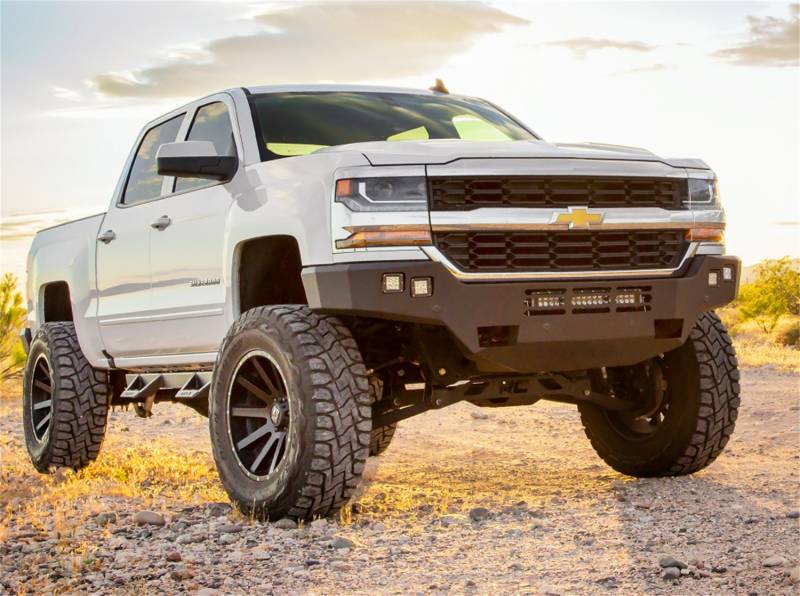 Give your 2016-2018 Silverado 1500 an aggressive style and stance with this Alumilite bumper. This aluminum bumper fits four square 3 in. cube LEDs, like the Baja Designs Squadrons, and a 20 in. LED light bar, like the Baja Designs S8, fits under the included bolt-on RT light mount. It can also fit an additional 20 in. LED light bar or 3 in. cube lights in the center vents. This bumper fits with and without front parking sensors and OE tow hooks. If you have a lifted Silverado and have upgraded your tire size, theres a good chance that you had to trim the front bumper to keep the tires from rubbing. This bumper eliminates that issue entirely by giving you all the clearance you could ever need. As an added bonus, this low-weight bumper (compared to the steel counterpart) will help those wheel bearings live longer!