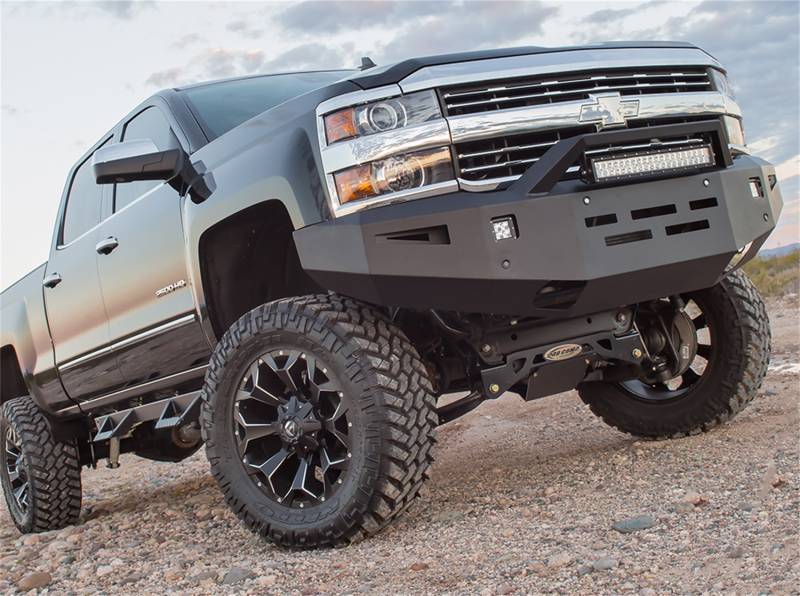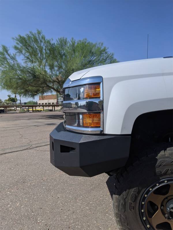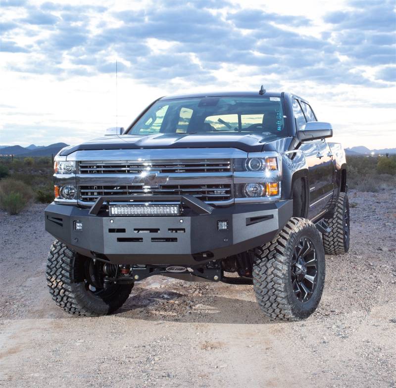 Add some options and style to the front of your 2015-2019 Silverado HD with this Alumilite bumper! This aluminum bumper can fit two square 3 in. cube LEDs, like the Baja Designs Squadron, and a 20 in. LED light bar, like the Baja Designs S8, fits under the included bolt-on RT light mount. This bumper fits with or without front parking sensors and OE tow hooks. The added clearance means no necessity to trim your front bumper to clear bigger tires and you wont have to turn up your torsion bars to compensate for the weight of this bumper.