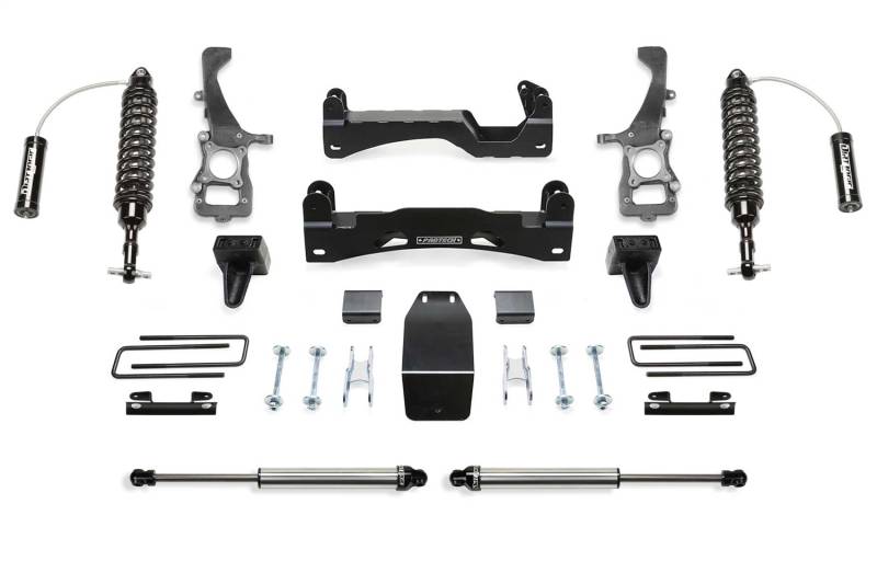Fabtech's world-renowned IFS suspension design for the Ford F150 provides excellent drive ability both on and off road. There is zero bump steer throughout the suspension cycle that helps reduce driver fatigue while improving the overall drive ability of the vehicle. The near-stock track width keeps the tires under the fenders for a clean appearance. Fabtech's proprietary steering knuckle geometry provides an excellent lock to lock turning radius to maneuver in tight spots. Heavy-duty 1/4 in. thick steel crossmembers feature eccentric style alignment cams for easy adjustment. Triple front diff mounts reposition the differential for vibration-free operation at high speed. The stainless-steel Dirt Logic 2.5 Coil overs provide 6 in. of lift with an outstanding ride quality both on and off road. They are designed for aggressive off-road use yet have a supple on road feel. Rear Dirt Logic 2.25 shocks aid in damping the vehicle for a balanced ride. At the rear of the vehicle, the factory 2 in. block is replaced with a 5 in. Block and U-bolt system. Fabtech has addressed all aspects of the suspension for proper wheel travel and lock to lock steering without over cycling. For added confidence, this lift comes with a free 5-year 60,000-mile Powertrain Warranty.